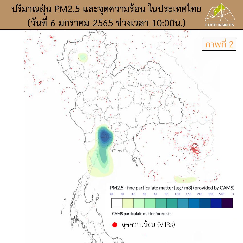 ข้อมูลดาวเทียม วันที่ 6 มกราคม 2565 ณ เวลา 10 โมงเช้า จะเห็นจุดสีฟ้าเข้มๆ คือความเข้มข้นของปริมาณฝุ่น PM2.5 และจุดสีแดงๆ คือจุดความร้อนอาจจะเกิดจากการเผาไหม้นะครับ