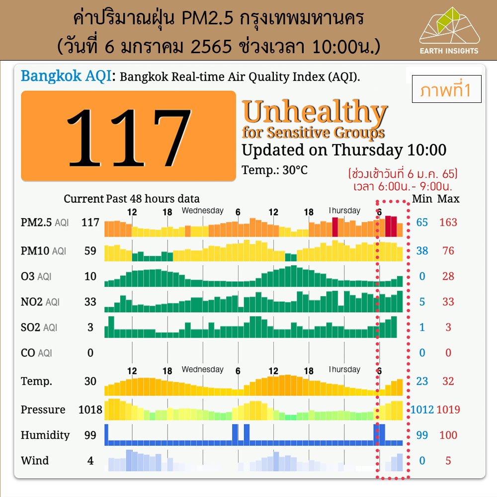 จากข้อมูลสถานีตรวจอากาศ (aqicn.org) วัดค่าฝุ่น PM2.5 ในวันที่ 6 มกราคม 2565 ช่วงเช้าเวลา09:00 น. แจ้งเตือนคุณภาพอากาศที่เริ่มมีผลกระทบต่อสุขภาพ และเมื่อดูกราฟช่วงเวลา 06:00-09:00 น. มีค่าสูงถึงขั้นเป็นอันตรายต่อสุขภาพแล้วนะครับ