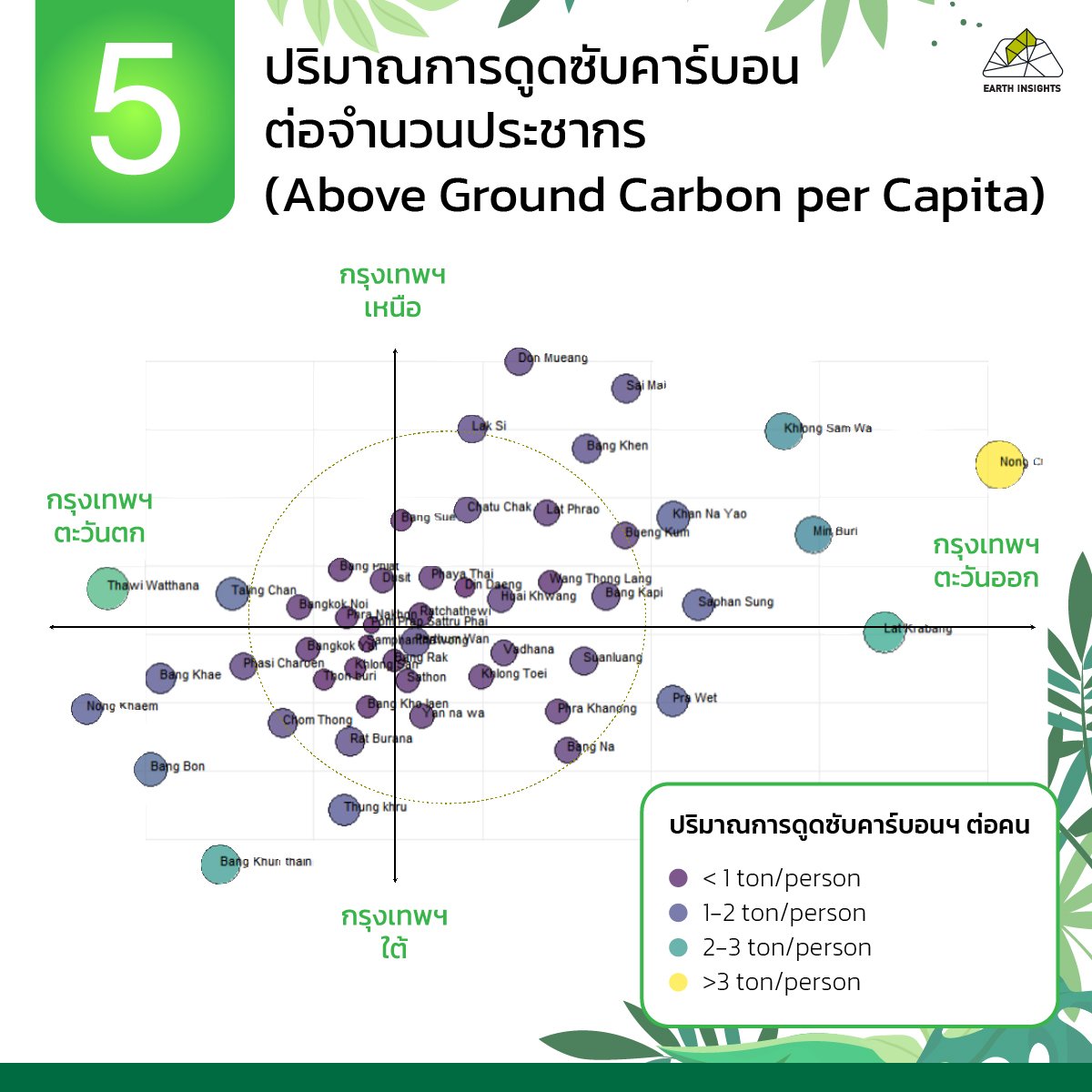 ดังนั้นเราก็จะเห็นว่าในบางพื้นที่นอกจากจำนวนประชากรจะหนาแน่นมากๆ แล้ว ยังมีปริมาณพื้นที่สีเขียวน้อยมากๆ ถ้ามีการปลูกต้นไม้ให้กระจายไปยังพื้นที่ว่างเปล่า หรือพื้นที่ไม่ได้ใช้ประโยชน์ เราก็จะได้ปริมาณการดูดซับคาร์บอนฯ เฉลี่ยต่อประชากรเพิ่มขึ้นด้วยนะครับ