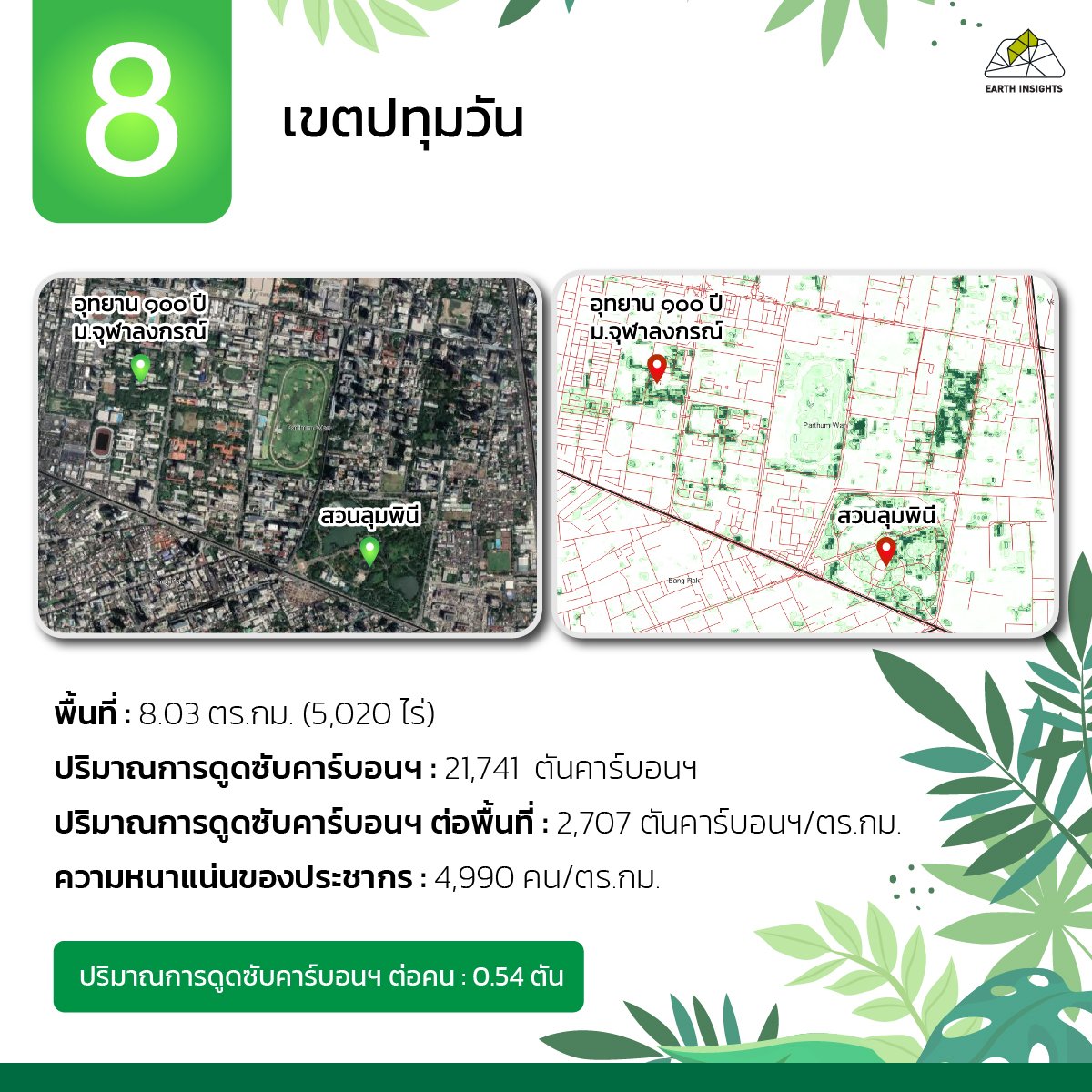 เขตปทุมวันมีพื้นที่ 8.03 ตารางกิโลเมตร (5,020 ไร่) มีปริมาณการดูดซับคาร์บอน 21,741 ตันคาร์บอนฯ หรือ 2,707 ตันคาร์บอนฯ/ตร.กม. โดยเขตนี้มีสวนลุมพินี ที่เป็นสวนสาธารณะขนาดใหญ่ 360 ไร่อยู่นะครับ แต่สวนนี้ต้นไม้จะไม่ได้หนาแน่มาก แถมยังมีสระน้ำกินบริเวณกว้าง จึงช่วยการดูดซับคาร์บอนฯ ได้ไม่มากเท่าไหร่นะครับ