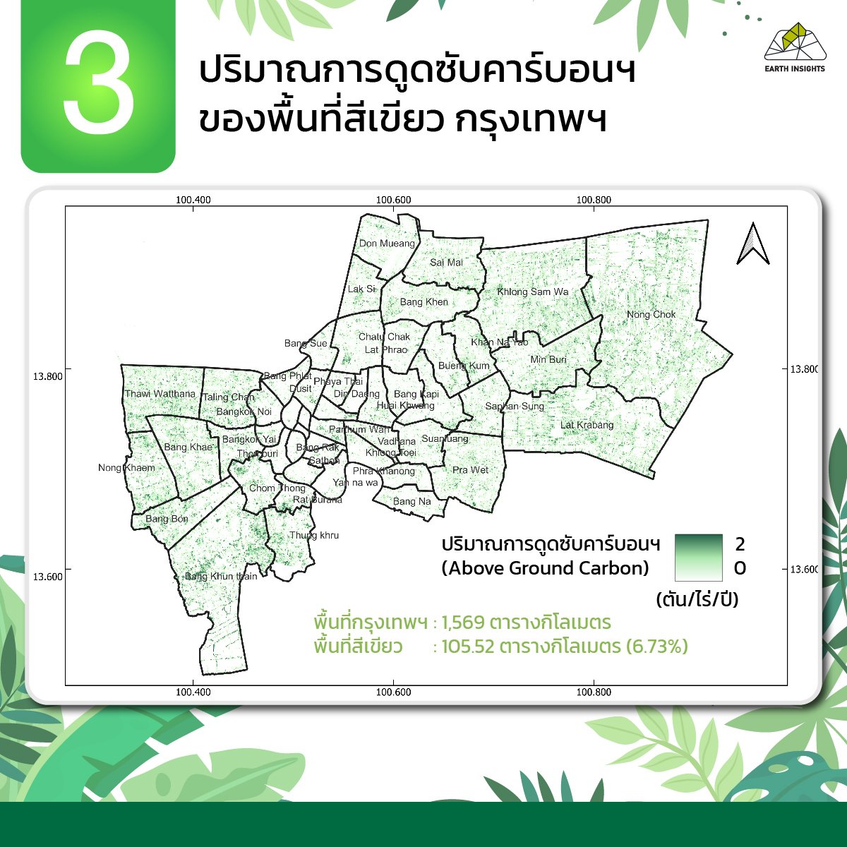 กรุงเทพฯ มีขนาดพื้นที่ 1,569 ตารางกิโลเมตร จากการวิเคราะห์โดยใช้ภาพถ่ายดาวเทียม และโมเดลในปี 2021 ของทีม Earth Insights พบว่ากรุงเทพฯ มีพื้นที่สีเขียว 105.52 ตารางกิโลเมตร หรือ 65,950 ไร่ คิดเป็น 6.73% ของพื้นที่ทั้งหมด มีประชากร (ตามทะเบียนบ้าน ไม่รวมประชากรแฝง) 5.51 ล้านคน และเขตที่มีพื้นที่สีเขียวมากที่สุด 10 อันดับแรก มีปริมาณการดูดซับคาร์บอนฯ ดังนี้ครับ