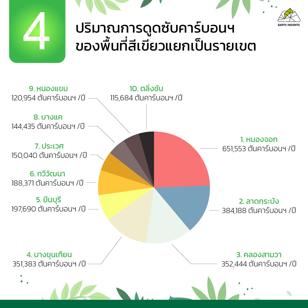อันดับ 1. หนองจอก 651,553 ตันคาร์บอนฯ 2. ลาดกระบัง 384,188 ตันคาร์บอนฯ 3. คลองสามวา 352,444 ตันคาร์บอนฯ 4. บางขุนเทียน 351,383 ตันคาร์บอนฯ 5. มีนบุรี 197,690 ตันคาร์บอนฯ 6. ทวีวัฒนา 188,371 ตันคาร์บอนฯ 7. ประเวศ 150,040 ตันคาร์บอนฯ 8. บางแค 144,435 ตันคาร์บอนฯ 9. หนองแขม 120,954 ตันคาร์บอนฯ 10. ตลิ่งชัน 115,684 ตันคาร์บอนฯ