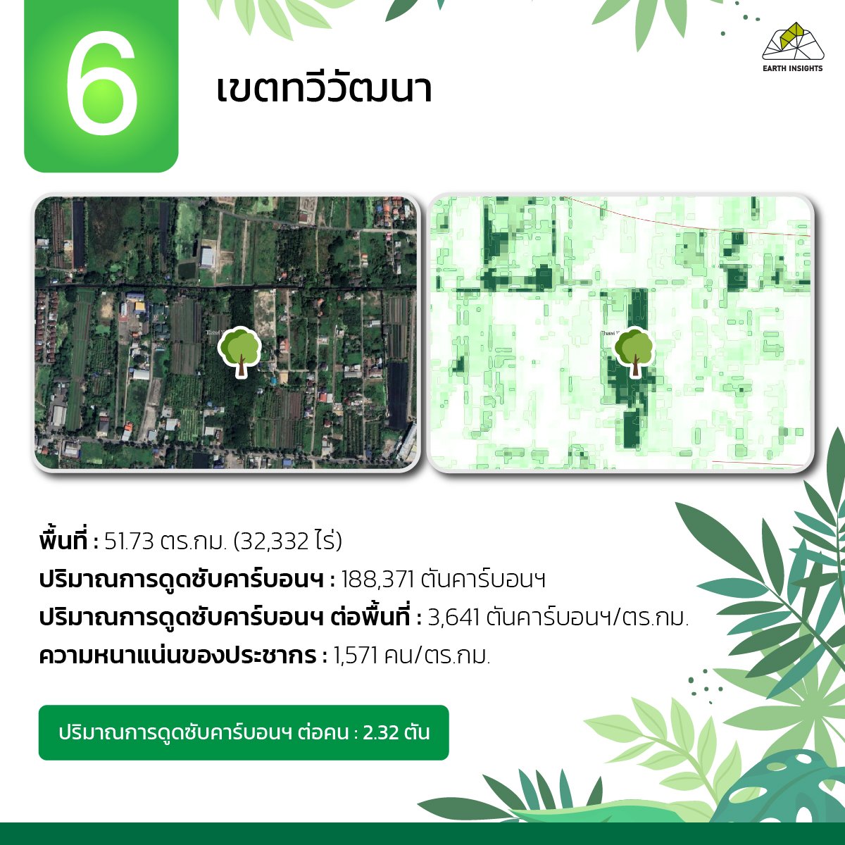 ผังเมืองเขตนี้ เดิมเป็นที่ดินประเภทอนุรักษ์ชนบท และเกษตรกรรม (ฟลัดเวย์) ก่อนที่จะมีการพัฒนาเป็นที่อยู่อาศัย และมีคนอยู่อาศัยเพิ่มมากขึ้น ดังนั้น ในบางพื้นที่ก็ยังมีต้นไม้ใหญ่ๆ อยู่เยอะเลยครับ จากการวิเคราะห์ เขตทวีวัฒนา มีค่าเฉลี่ยปริมาณการดูดซับคาร์บอนฯ อยู่ที่ 2.32 ตันต่อคนครับ
