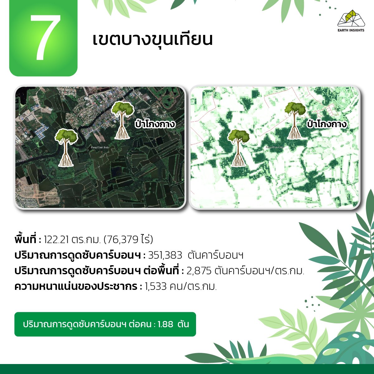 เขตบางขุนเทียน มีพื้นที่ 122.21 ตร.กม. (76,379 ไร่) มีปริมาณการดูดซับคาร์บอน 351,383 ตันคาร์บอนฯ หรือ 2,875 ตันคาร์บอนฯ/ตร.กม. ซึ่งเขตนี้ได้เปรียบ ตรงที่มีป่าโกงกางอยู่นะครับ ป่าโกงกางมีการดูดซับคาร์บอนสูงที่สุด ในบรรดาต้นไม้ทั้งหมด โดยป่าโกงกางโตเต็มที่ 1 ไร่ (ประมาณ 711 ต้น) จะดูดซับคาร์บอนได้ถึง 6.49 ตันคาร์บอนต่อปี