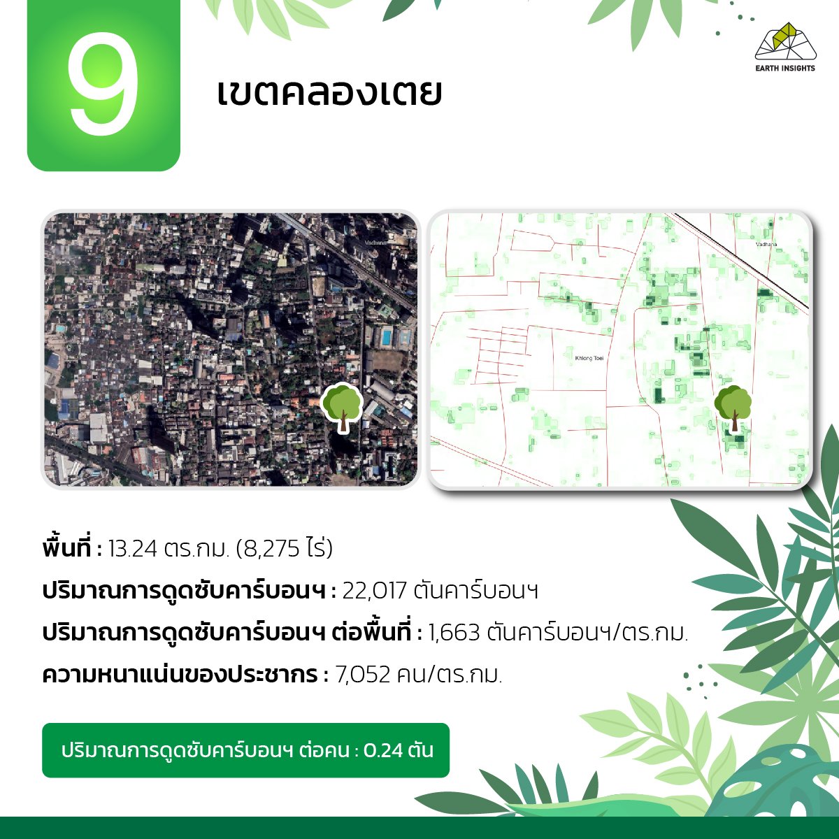เขตคลองเตย มีพื้นที่ 13.24 ตร.กม. (8,275 ไร่) มีปริมาณการดูดซับคาร์บอน 22,017 ตันคาร์บอนฯ หรือ 1,663 ตันคาร์บอนฯ/ตร.กม. มีจำนวนประชากรหนาแน่นมากเลยครับ อยู่ที่ 7,052 คน/ตร.กม. และเขตนี้มีต้นไม้อยู่น้อยมากๆ จึงมีค่าเฉลี่ยปริมาณการดูดซับคาร์บอนฯ อยู่ที่ 0.24 ตันต่อคน ครับ