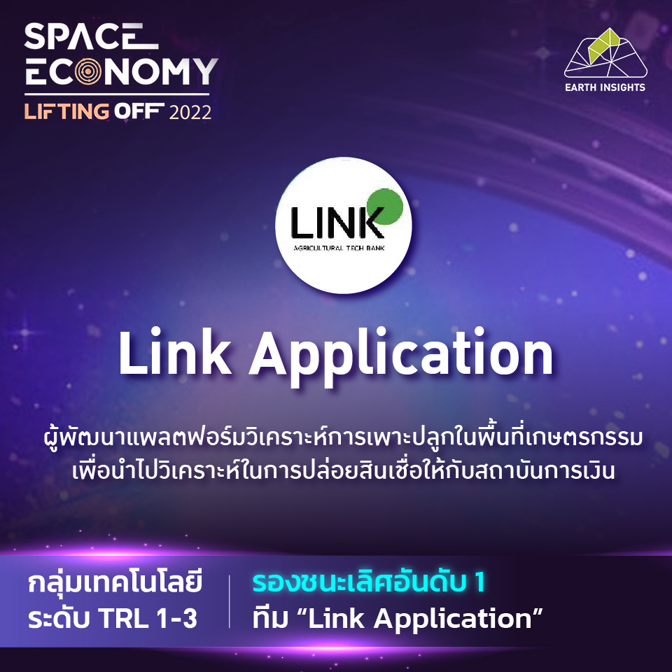-รางวัลรองชนะเลิศอันดับ 1 ได้แก่ Link Application ผู้พัฒนาแพลตฟอร์มวิเคราะห์การเพาะปลูกในพื้นที่เกษตรกรรม เพื่อนำไปวิเคราะห์ในการปล่อยสินเชื่อให้กับสถาบันการเงิน