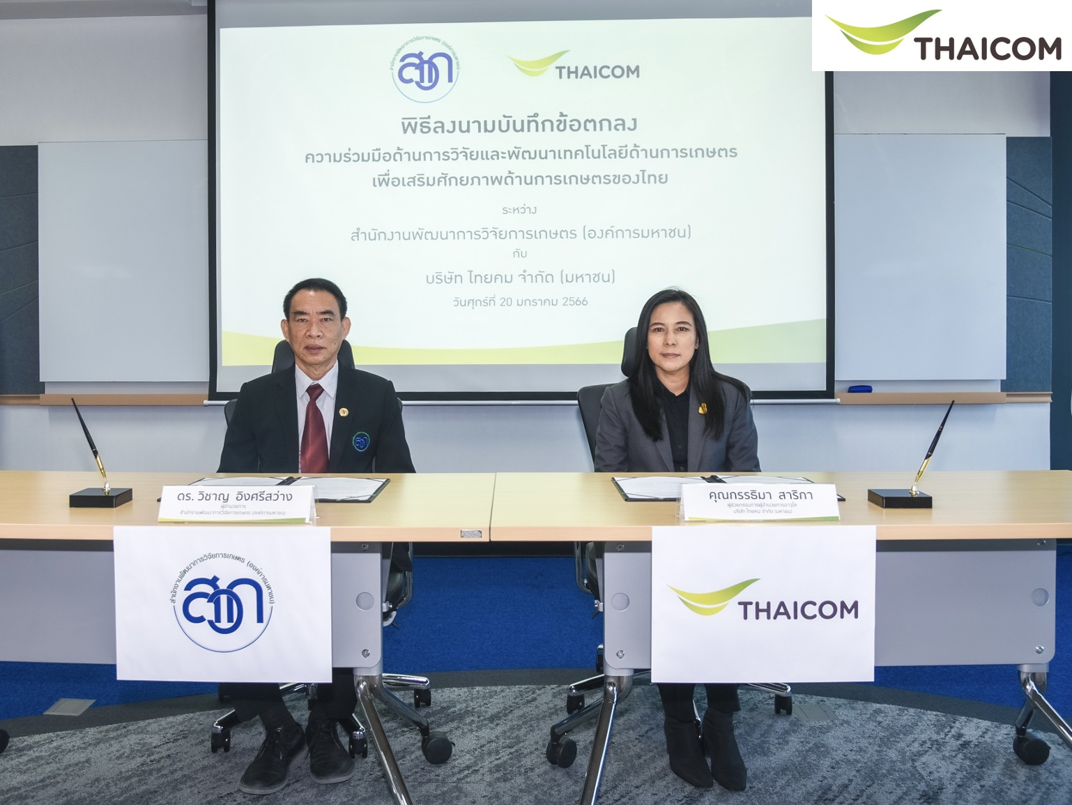 ไทยคม และ สำนักงานพัฒนาการวิจัยการเกษตร (องค์การมหาชน) หรือสวก.จัดพิธีลงนามบันทึกข้อตกลงความร่วมมือด้านการวิจัยและพัฒนาเทคโนโลยีด้านการเกษตร เพื่อเสริมศักยภาพด้านการเกษตรของไทย เมื่อวันศุกร์ที่ 20 มกราคม 2566 ณ บริษัท ไทยคม จำกัด (มหาชน) สำนักงานใหญ่