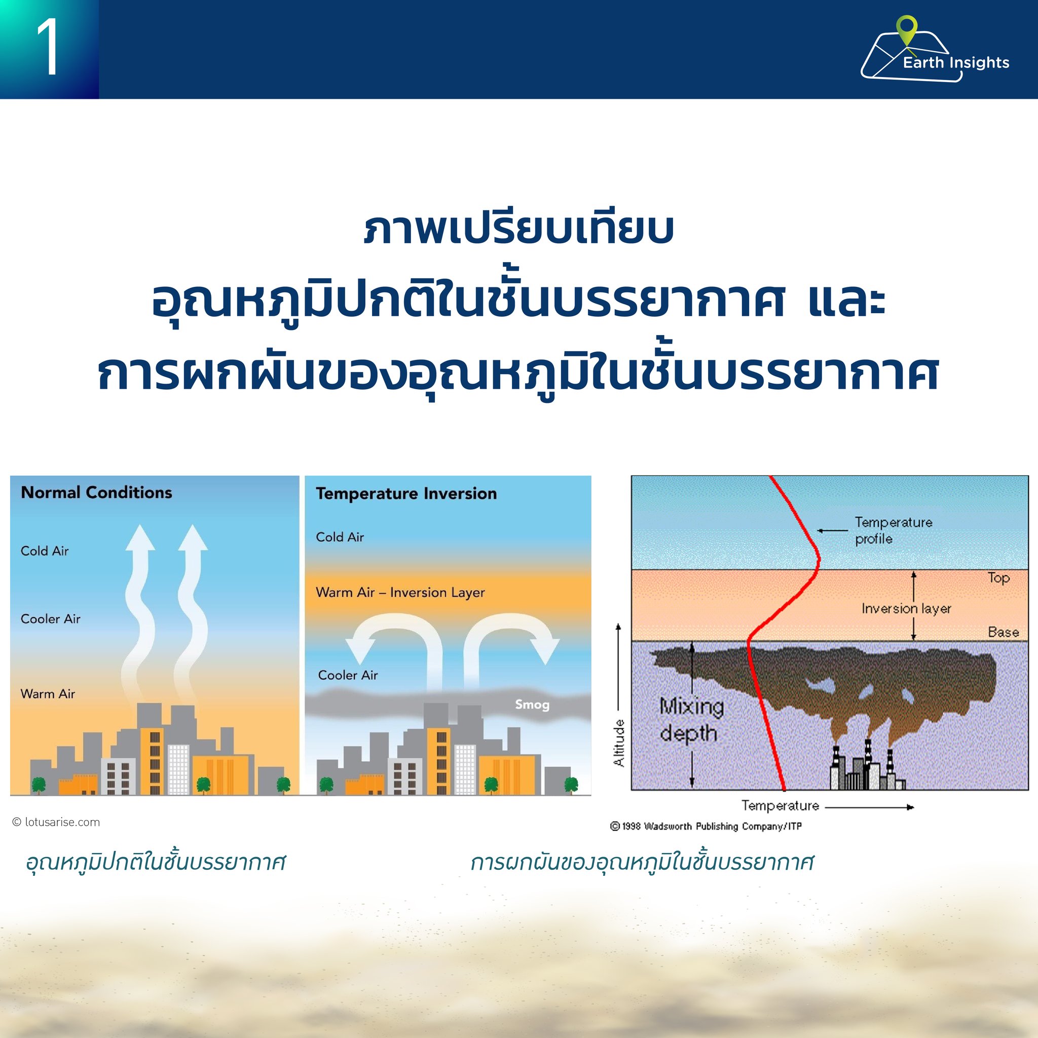 ตามปกติ อุณหภูมิจะลดลงเมื่อความสูงเพิ่มขึ้น แต่เมื่อเกิดอุณหภูมิผกผัน ชั้นบรรยากาศจะมีลักษณะคล้าย “เย็น–ร้อน–เย็น” เหมือนแซนด์วิช (ดังภาพที่ 1) โดยชั้นอากาศที่อุ่นกว่าจะทำหน้าที่เหมือน “ฝาปิด” ทำให้ฝุ่นและมลพิษไม่สามารถลอยขึ้นไปกระจายตัวได้ดี ส่งผลให้ PM2.5 สะสมหนาแน่นใกล้ผิวดินมากขึ้น นี่เป็นเหตุผลว่าทำไมบางช่วงถึงรู้สึกว่า “ฝุ่น PM2.5 พุ่งขึ้นสูง” แม้แหล่งกำเนิดจะไม่ได้เพิ่มขึ้นแบบก้าวกระโดดก็ตาม