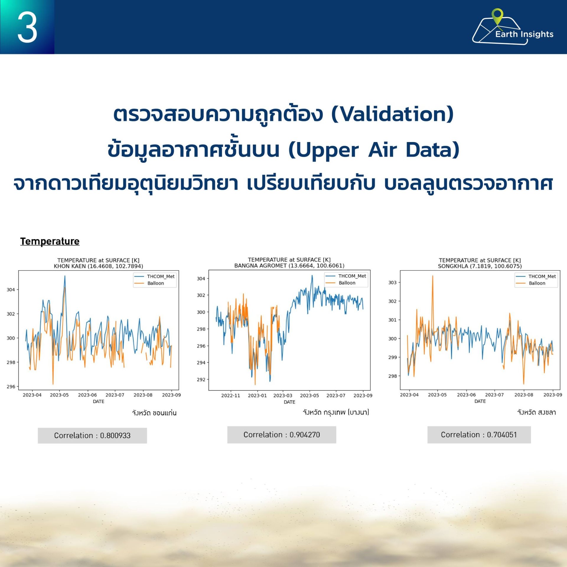 เริ่มต้นด้วยข้อมูลจากดาวเทียม ครั้งนี้เราใช้ดาวเทียมอุตุนิยมวิทยา GNSS-RO ย่อมาจาก Global Navigation Satellite System – Radio Occultation ซึ่งมีจุดเด่นคือสามารถวัด “โครงสร้างบรรยากาศเป็นชั้น ๆ ในแนวดิ่ง” ได้คล้ายกับการปล่อยบอลลูนตรวจอากาศ ทำให้เราได้โปรไฟล์อากาศตามความสูง เช่น อุณหภูมิ ความเร็วลม ทิศทางลม และตัวแปรบรรยากาศอื่น ๆ (ดังภาพที่ 2) จุดสำคัญคือ ในประเทศไทยมีการปล่อยบอลลูนเป็นประจำแต่มีจำนวนจุดตรวจวัดจำกัด (ประมาณ 12 จุด) ซึ่งยังไม่เพียงพอถ้าต้องการประเมินความเสี่ยงให้ครอบคลุมทั้งประเทศ ดังนั้นข้อมูลจากดาวเทียมจึงเป็นตัวช่วยสำคัญในการเติมช่องว่างเชิงพื้นที่ อย่างไรก็ตาม ก่อนนำข้อมูล GNSS-RO ไปใช้จริง เราต้องทำขั้นตอนที่สำคัญ คือ ตรวจสอบความสอดคล้อง (correlation/validation) โดยเทียบข้อมูลดาวเทียมกับข้อมูลบอลลูนตรวจอากาศในช่วงเวลาและพื้นที่เดียวกัน (ดังภาพที่ 3) เพื่อยืนยันความน่าเชื่อถือ เมื่อมั่นใจแล้วจึงนำไปสร้างตัวแปรบ่งชี้สภาวะอากาศปิด หรือปรากฎการอุณหภูมิผกผัน และป้อนเข้าโมเดล Machine Learning เพื่อคาดการณ์แนวโน้ม ความเสี่ยงต่อการเกิดมลพิษทางอากาศ ล่วงหน้าได้อย่างเป็นระบบ โดยระดับความเสี่ยงจะขึ้นอยู่การคาดการณ์อัตราการระบายอากาศในแต่ละพื้นที่ครับ