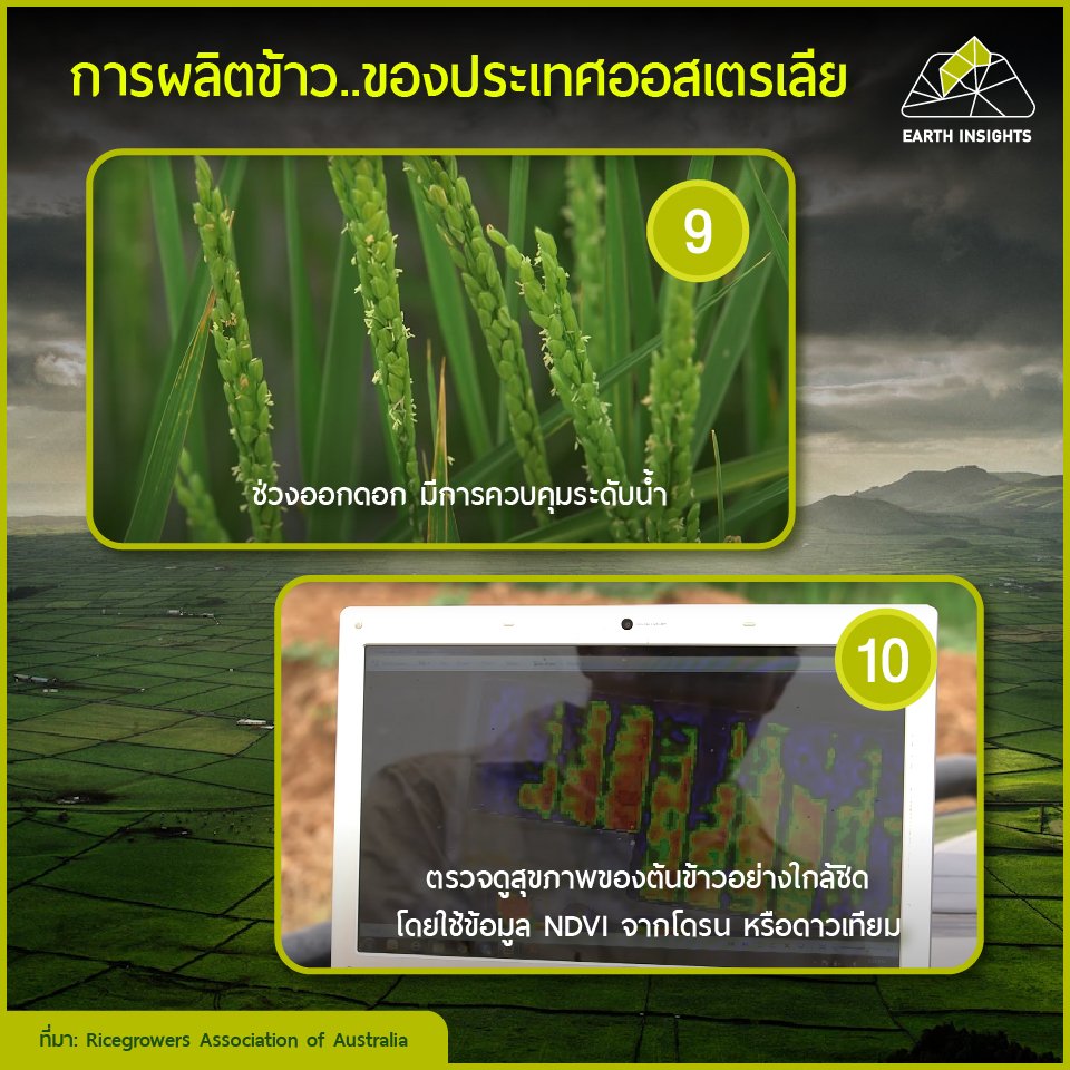 ต่อมาช่วงแตกกอ จะมีการปล่อยน้ำเข้าแปลง โดยการเปิดที่กั้นน้ำ ช่วงออกดอกก็มีการควบคุมระดับน้ำให้เหมาะสม และมีการตรวจดูสุขภาพพืชอย่างใกล้ชิด โดยใช้เทคโนโลยี ข้อมูล NDVI (ดัชนีความสมบูรณ์ของพืชพรรณ) จากโดรน หรือดาวเทียม ถ้าตรงจุดไหนแสดงสีที่ผิดปกติ เช่น เหลือง ส้ม หรือแดง ซึ่งอาจมีสาเหตุจากโรคแมลง น้ำหรือปุ๋ยไม่พอ จะได้แก้ไขได้ทันท่วงทีครับ