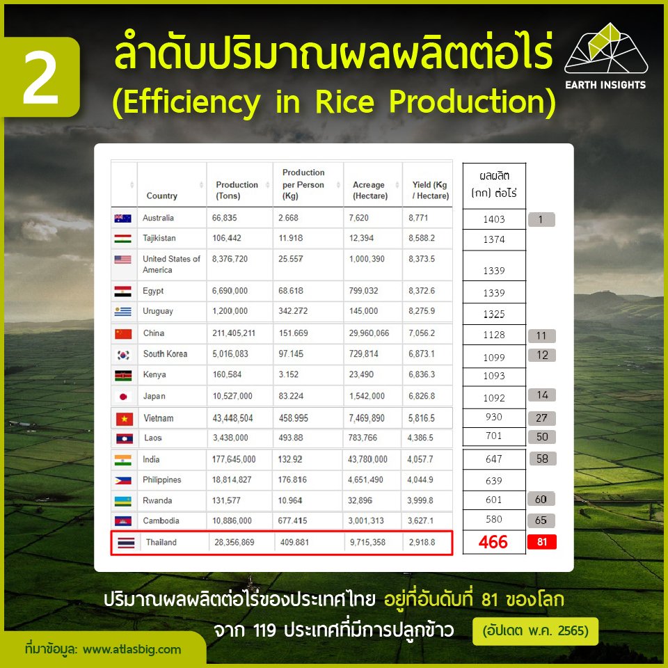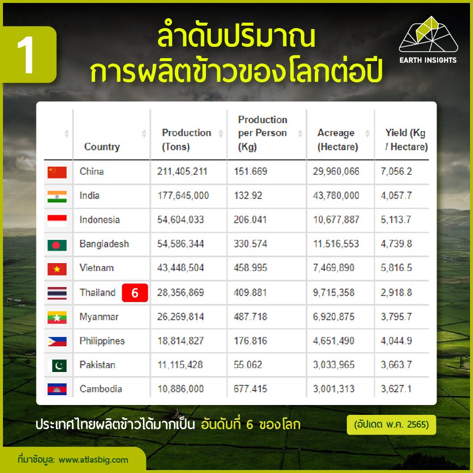 ดูจากสถิติ World Rice Production by Country (ภาพที่ 1) ประเทศไทยเราผลิตข้าว (ปี 2564) ได้จำนวน 28 ล้านตัน และใช้พื้นที่ปลูกข้าว 60 ล้านไร่ (9.7 เฮกตาร์) อยู่อันดับที่ 6 ของโลก ซึ่งก็ยังแพ้เวียดนาม ที่ผลิตข้าวได้ 43 ล้านตัน และใช้พื้นที่ปลูกข้าว 46 ล้านไร่ (7.4 เฮกตาร์) ซึ่งอยู่อันดับที่ 5 ของโลก