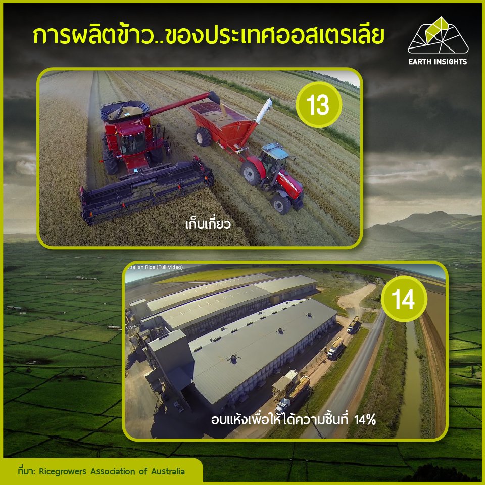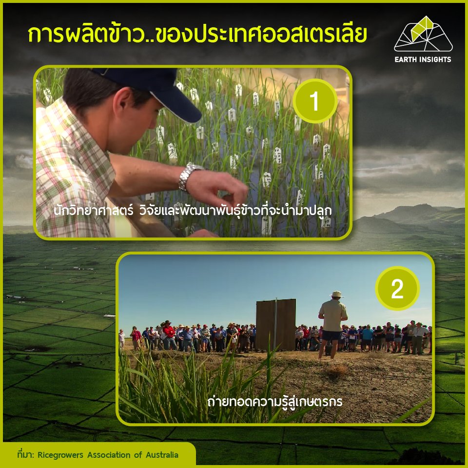 พื้นที่ผลิตข้าวของไทยเราเยอะกว่าเวียดนามก็จริง แต่ปริมาณผลผลิตข้าวต่อไร่ (rice yield) ของเรายังต่ำมาก จากข้อมูลสถิติ (ภาพที่ 2) ปริมาณผลผลิตต่อไร่ ของเราอยู่ที่ 466 กิโลกรัม/ไร่ และอยู่อันดับที่ 81 ของโลก จาก 119 ประเทศที่ปลูกข้าว ซึ่งก็ยังน้อยกว่าผลผลิตข้าวของประเทศเพื่อนบ้านรอบ ๆ เราด้วยนะครับ เช่น ประเทศเวียดนาม 930 กก./ไร่, ประเทศลาว 701 กก./ไร่, กัมพูชา 580 กก./ไร่, และประเทศที่ครองอันดับหนึ่งมาโดยตลอด ก็คือประเทศออสเตรเลีย ที่เป็นประเทศเกาะ กลางประเทศเป็นทะเลทราย และมีน้ำจืดอยู่อย่างจำกัด แต่ปลูกข้าวได้ผลผลิตอยู่ที่ 1,403 กก./ไร่  แล้วเค้าสามารถสร้างผลผลิตได้อย่างมีประสิทธิภาพ ภายใต้ข้อจำกัดที่มีอยู่มากมายเช่นนี้ได้อย่างไร แอดมินจะเล่าให้ฟังครับ