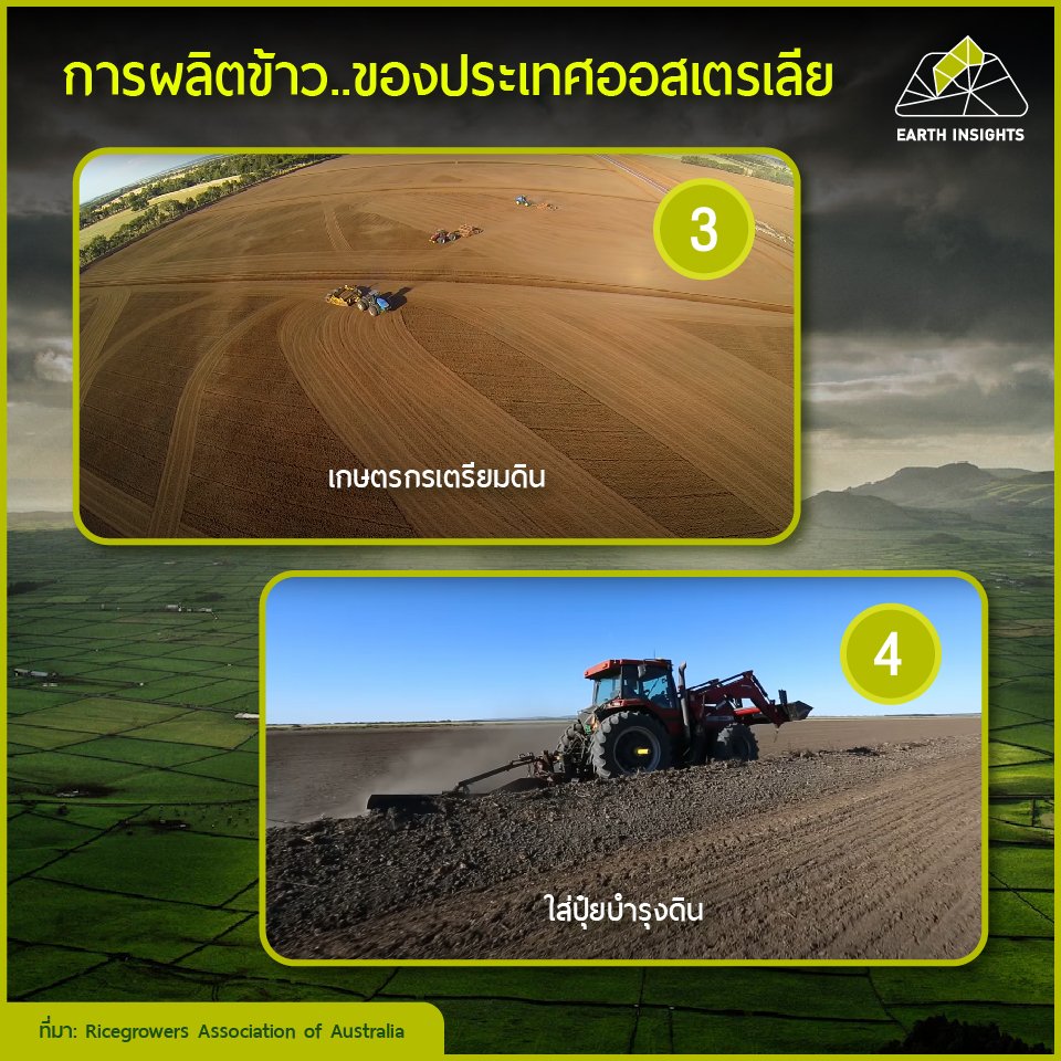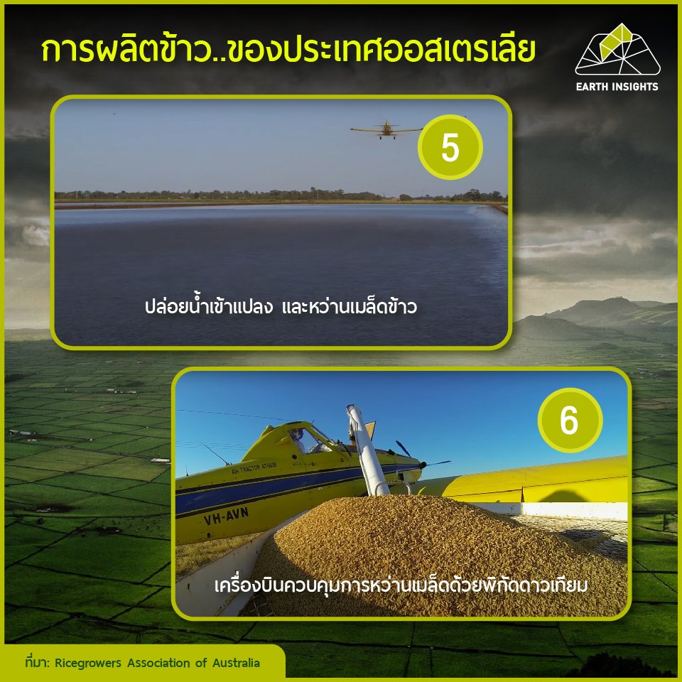 จากนั้นเกษตรกรจะมีการเตรียมดิน ใส่ปุ๋ยบำรุงดิน มีการปล่อยน้ำเข้าแปลง และใช้เครื่องบินขนาดเล็กควบคุมการหว่านเมล็ดพันธุ์ข้าวด้วยพิกัดดาวเทียม