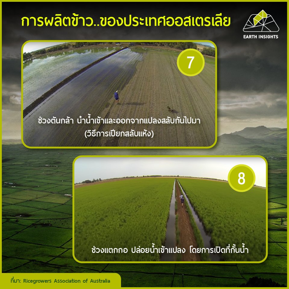 และในช่วงต้นกล้า จะมีการปล่อยน้ำเข้าและออกสลับกันไป ซึ่งจะเป็นวิธีการเดียวกับที่กรมการข้าวของไทยเรา แนะนำให้เกษตรกรทำ ที่เรียกว่า “เปียกสลับแห้งแกล้งข้าว” นะครับ วิธีการนี้ จะทำให้ประหยัดการใช้น้ำไปได้ประมาณ 30-50% ลดปัญหานาหล่ม ป้องกันเพลี้ยกระโดดสีน้ำตาล เนื่องจากความชื้นที่โคนกอข้าวต่ำ และกระตุ้นการออกรากของข้าว แต่วิธีการนี้ ก็จะเหมาะกับนาชลประทาน ที่สามารถควบคุมน้ำได้นะครับ