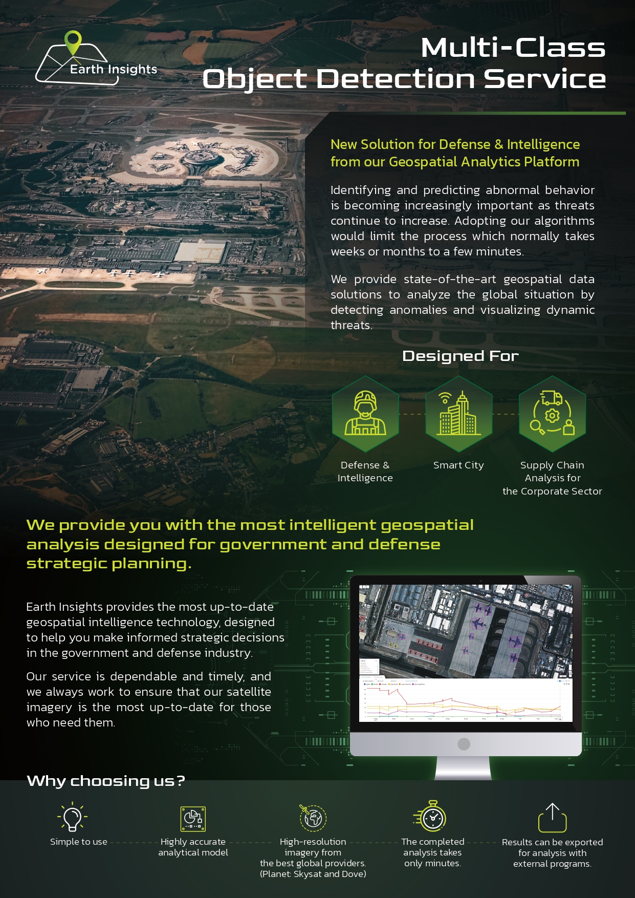บริการตรวจนับและจำแนกประเภทยานพาหนะของแพลตฟอร์ม Earth Insights ครอบคลุมการจำแนกประเภทและชนิดของ ยานพาหนะ ทั้งทางบก ทางน้ำ และอากาศยาน มากไปกว่านั้น ผลการวิเคราะห์ครอบคลุมไปถึงการแสดงจำนวนเชิงปริมาณของวัตถุแต่ละชิ้นที่ตรวจจับได้ในแต่ละช่วงเวลา โดยสรุปข้อมูลออกมาในรูปแบบของกราฟ ประโยชน์จากการตรวจนับและจำแนกประเภทยานพาหนะนั้น สามารถช่วยให้ผู้ใช้งานเปรียบเทียบ, ติดตาม, วิเคราะห์, และรายงานข้อมูลการวิเคราะห์ยานพาหนะในระยะเวลาที่แตกต่างกันอีกด้วย ยกตัวอย่างเช่น การตรวจเช็กการสะสมกำลังพลและยุทโธปกรณ์ในบริเวณพื้นที่ต้องสงสัย ซึ่งอาจะเป็นพื้นที่ที่เจ้าหน้าที่ไม่สามารถเข้าถึงได้ แต่มีความต้องการในลักษณะการสอดแนม เพื่อการวางแผนเชิงกลยุทธ์ เป็นต้น
