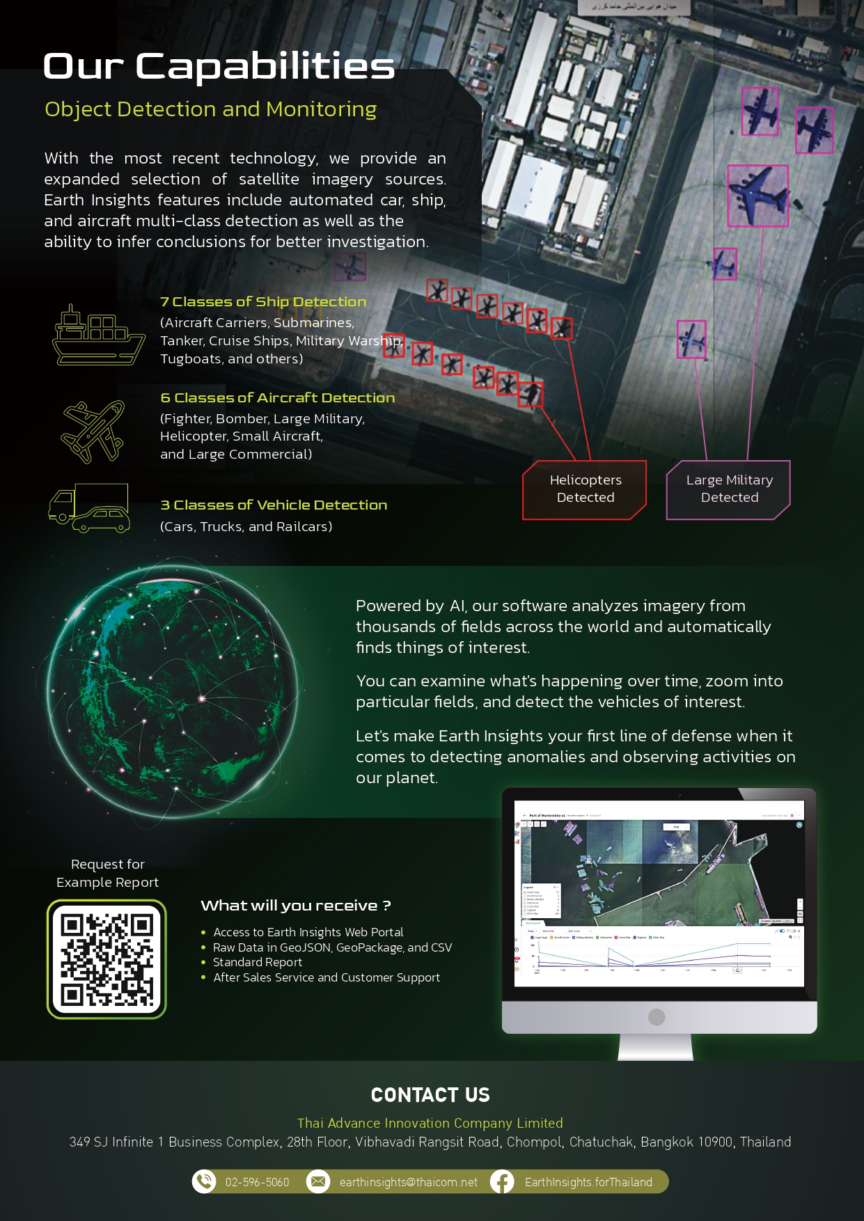 การวิเคราะห์ข้อมูลภาพถ่ายดาวเทียมด้วยระบบปัญญาประดิษฐ์ นับเป็นเรื่องใหม่ที่ได้รับความนิยมสูง และมีการใช้งานอย่างแพร่หลายทั่วโลก แพลตฟอร์ม Earth Insights นำเข้าข้อมูลภาพถ่ายดาวเทียมจากกลุ่มดาวเทียมสำรวจ Skysat ของบริษัทชั้นนำสัญชาติอเมริกันอย่าง Planet Labs ที่สามารถจับภาพได้ทุกที่บนพื้นโลกที่ความละเอียด 0.5 เมตรต่อพิกเซล ข้อมูลเหล่านั้นจะถูกนำมาวิเคราะห์โดยอัตโนมัติด้วยเทคโนโลยีระบบปัญญาประดิษฐ์ ที่มีความสามารถในการตรวจจับและจำแนกวัตถุแต่ละชนิดที่ระบบตรวจพบ ซึ่งระบบดังกล่าว ทางไทยคมได้ร่วมกันพัฒนาขึ้นกับพาร์ทเนอร์ระดับโลกอย่าง Orbital Insight จึงมั่นใจได้ว่าผลลัพธ์ที่ได้มีประสิทธิภาพสูง แม่นยำ และรวดเร็ว