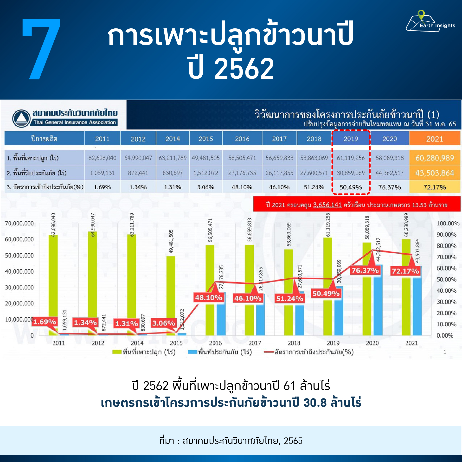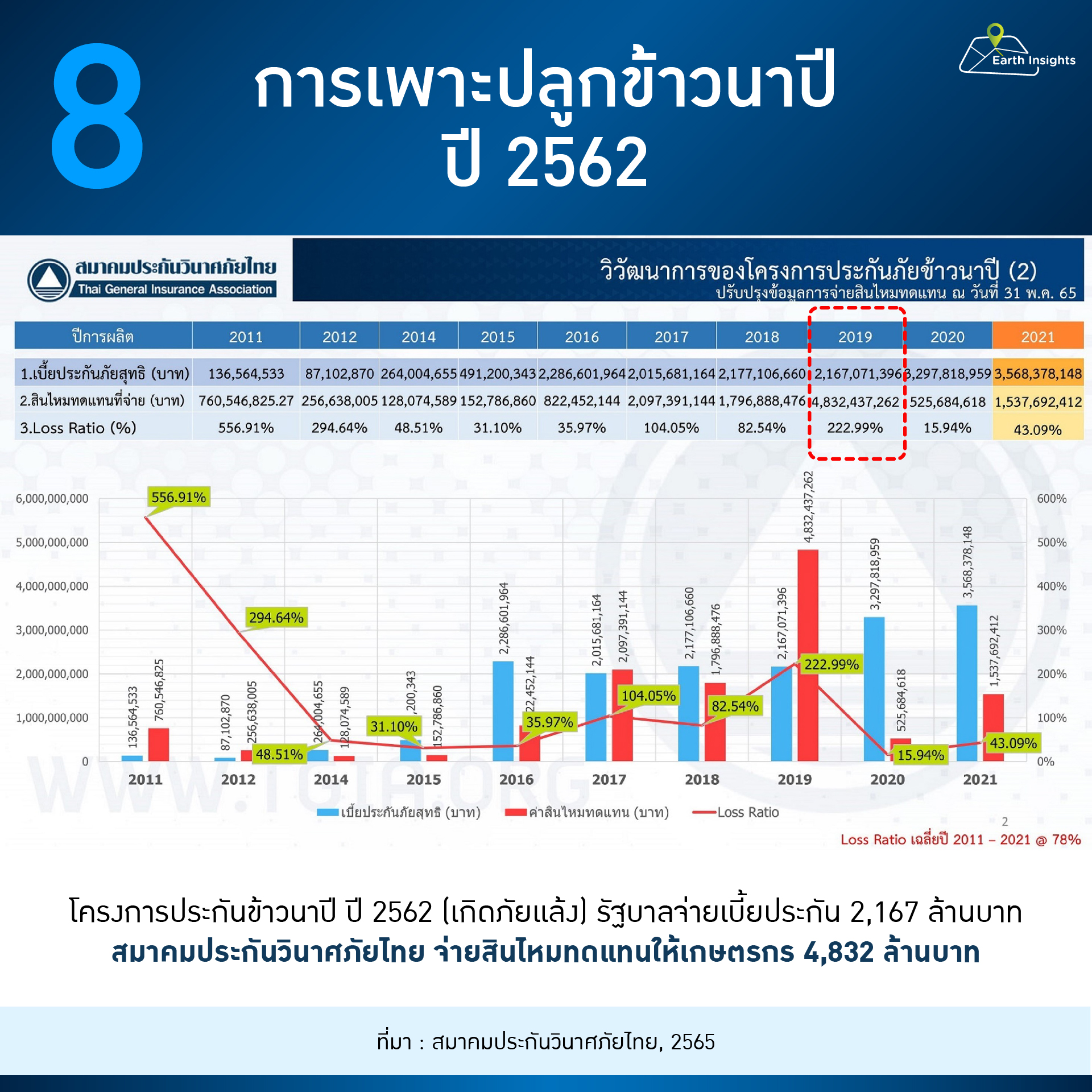 จากข้อมูลของสมาคมประกันวินาศภัยไทย (ภาพที่ 7,8) ปี 62 พื้นที่เพาะปลูกข้าวนาปี 61 ล้านไร่ เข้าโครงการประกันภัยข้าวนาปี ไป 30.8 ล้านไร่ รัฐบาลใช้เงินเพื่อจ่ายเบี้ยประกัน 2,167 ล้านบาท แต่เกิดภัยแล้งอย่างหนัก ทำให้สมาคมประกันวินาศภัยไทย ต้องจ่ายสินไหมทดแทนให้กับเกษตรกรถึง 4,832 ล้านบาท (ภาพที่ 7) (ก็ขาดทุนถัวๆ กับปีที่ไม่ค่อยเคลมนะครับ) ซึ่งในปีนั้น เกษตรกรที่ทำประกัน แล้วเกิดภัยธรรมชาติ ก็ได้รับเงินสินไหมทดแทน 2,373 บาทต่อไร่ (ได้จากรัฐบาล 1,113 บาท + สมาคมประกันฯ 1,260 บาท) ซึ่งก็พอจะช่วยเหลือเกษตรกรได้บ้างนะครับ เพราะต้นทุนการเพาะปลูกข้าว จากการศึกษาข้อมูลจะอยู่ที่ประมาณ 3,300 บาทต่อไร่