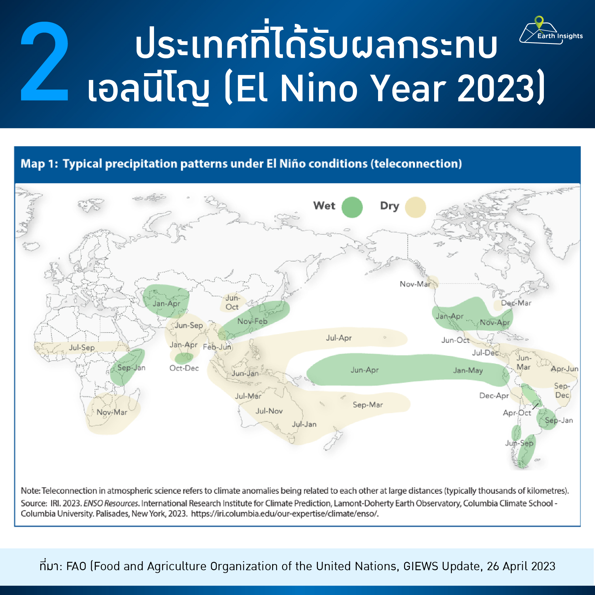 ส่วนประเทศที่ได้รับผลกระทบจาก เอลนีโญ ก็ไม่ใช่ทุกประเทศทั่วโลกหรอกครับ คนที่กระทบก็จะเป็นกลุ่มประเทศ ในโซนมหาสมุทรแปซิฟิกนี่แหละ ดูข้อมูลจาก FAO (Food and Agriculture Organization of the United Nations (ภาพที่ 2) ก็จะเห็นได้ว่ามีบางประเทศที่เกิด ภัยแล้ง เช่น ประเทศไทย และบางประเทศเกิดน้ำท่วม ซึ่งเราก็กำลังก้าวเข้าสู่ เอลนีโญ แบบเต็มตัวก็เดือนนี้ (มิถุนายน 2566) นี่แหละครับ