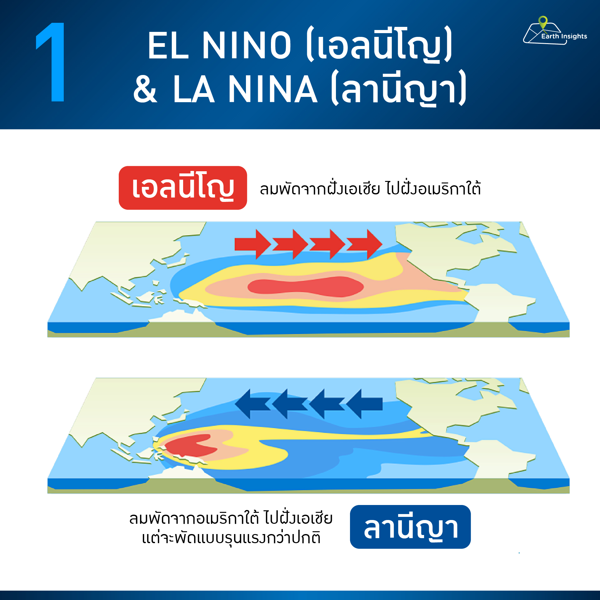 เอลนีโญ ก็คือกระแสลม (Trade winds) ที่พัดผิดปกติ โดยเปลี่ยนเป็นพัดจากฝั่งเอเชียบ้านเรา ไปยังอเมริกาใต้ ทำให้ฝนไปตกที่แถบอเมริกาใต้มาก ส่วนฝั่งเอเชียบ้านเราก็จะฝนน้อย แห้งแล้ง ร้อนขึ้น หน้าหนาวก็หนาวไม่มาก และหนาวช่วงสั้นๆ (ภาพที่ 1)
