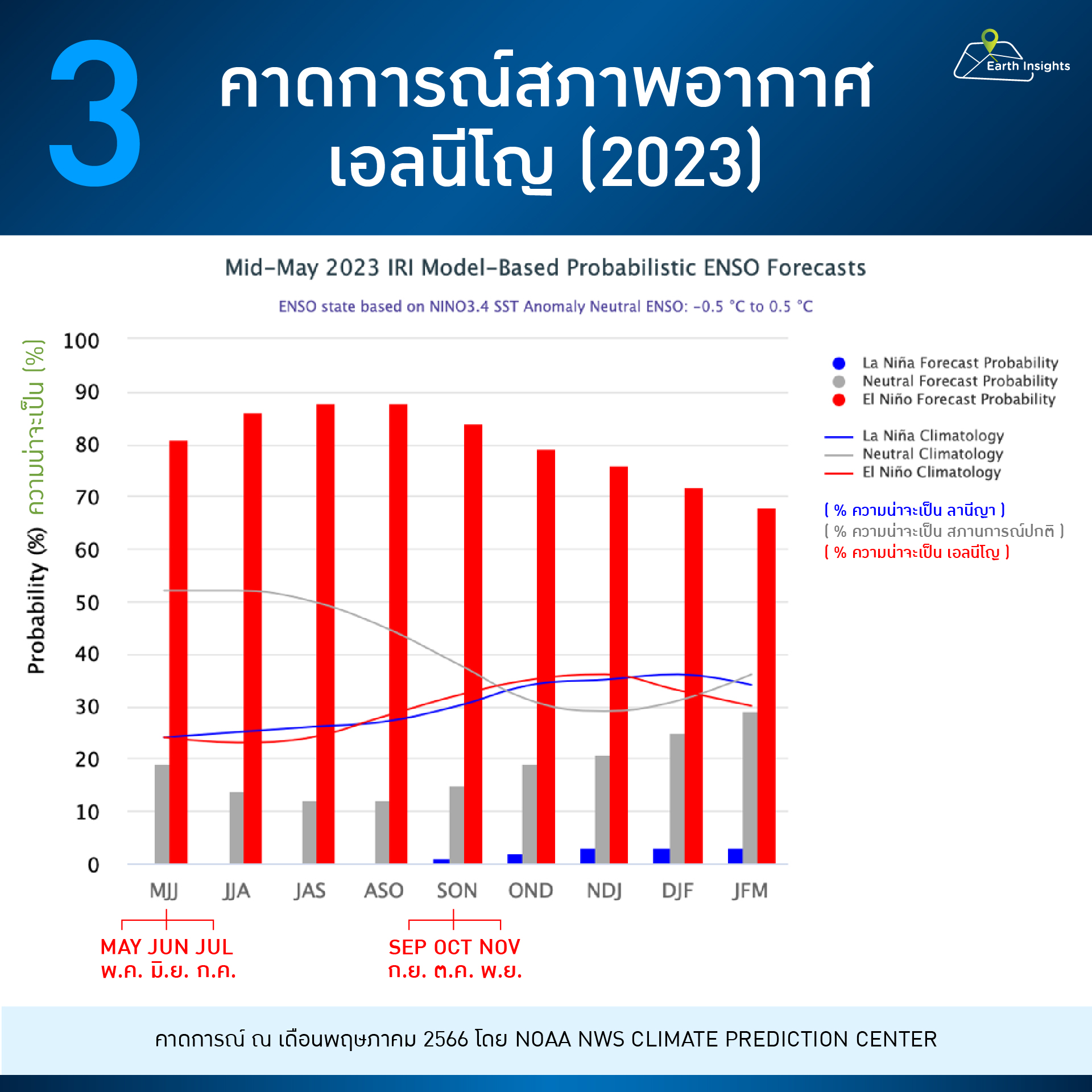แล้วมันจะแล้งรุนแรงขนาดไหน เราดูได้จากการ ENSO Forecast จากสถาบัน National Oceanic and Atmospheric Administration (NOAA) ประเทศสหรัฐอเมริกา ซึ่งกราฟจะแสดงความน่าจะเป็นในช่วงทุกๆ 3 เดือน และคาดการณ์ออกมาเป็น % ความน่าจะเป็นของสถานการณ์นั้นๆ เช่น แท่งกราฟสีแดง แสดง % ความน่าจะเป็นของเอลนีโญ (El Nino Forecast Probability) สีน้ำเงิน แสดง % ของลานีญา (La Nina Forecast Probability), และแท่งสีเทาแสดง % ความน่าจะเป็นของสถานการณ์ปกติ (Neutral Forecast Probability) คือปริมาณน้ำฝนไม่มากหรือน้อยไปกว่าค่าเฉลี่ย 30 ปี ของช่วงเวลานั้น