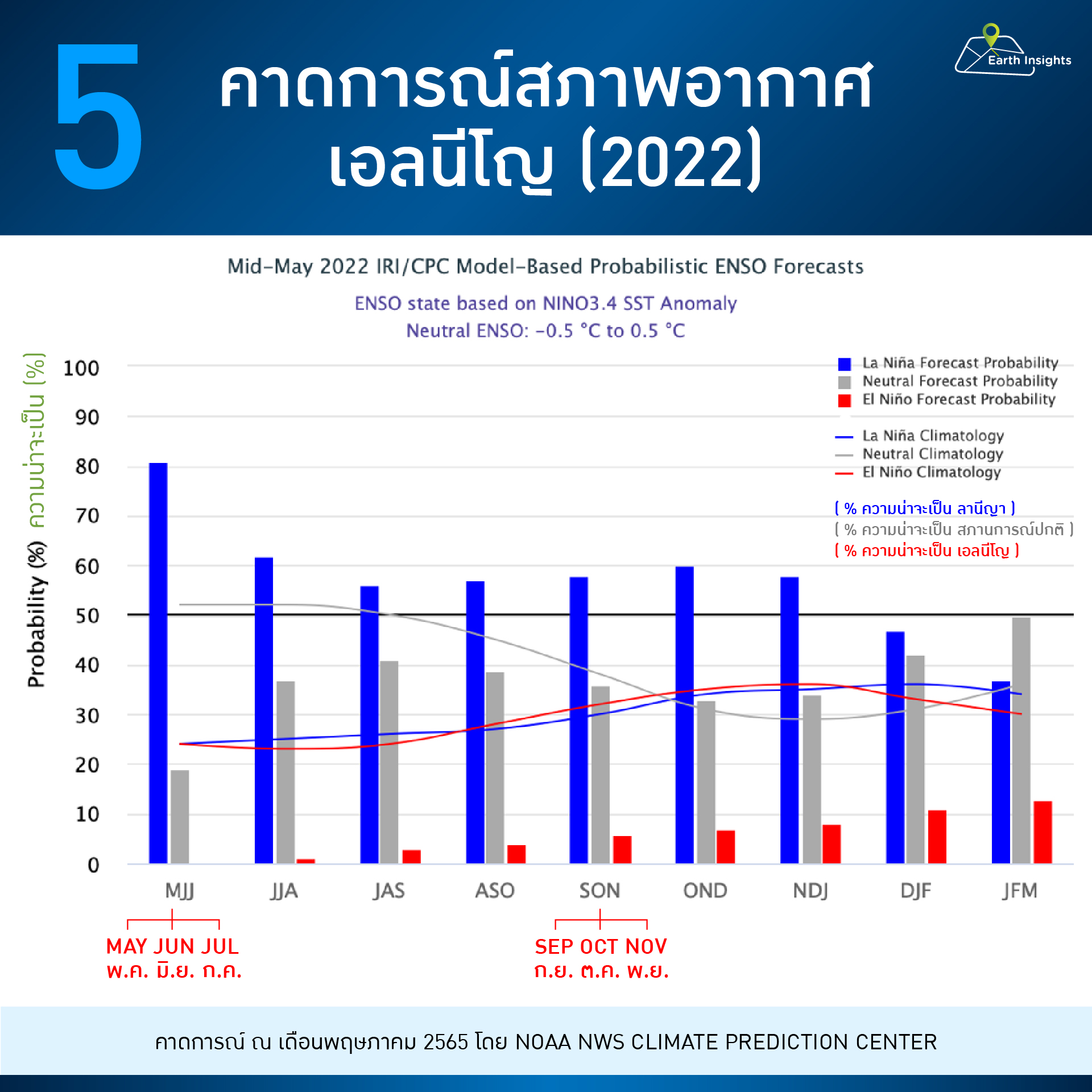 อีกตัวอย่าง ที่นำข้อมูลมาให้ลองดูว่าถ้าเป็นปี ลานีญ่า หน้าตาของกราฟจะเป็นยังไง (ภาพที่ 5) ของปีที่แล้ว 2022 จะเห็นกราฟแท่งสีน้ำเงินสูงกว่าแท่นอื่นๆ ซึ่งปีที่แล้ว ทุกคนก็จะ