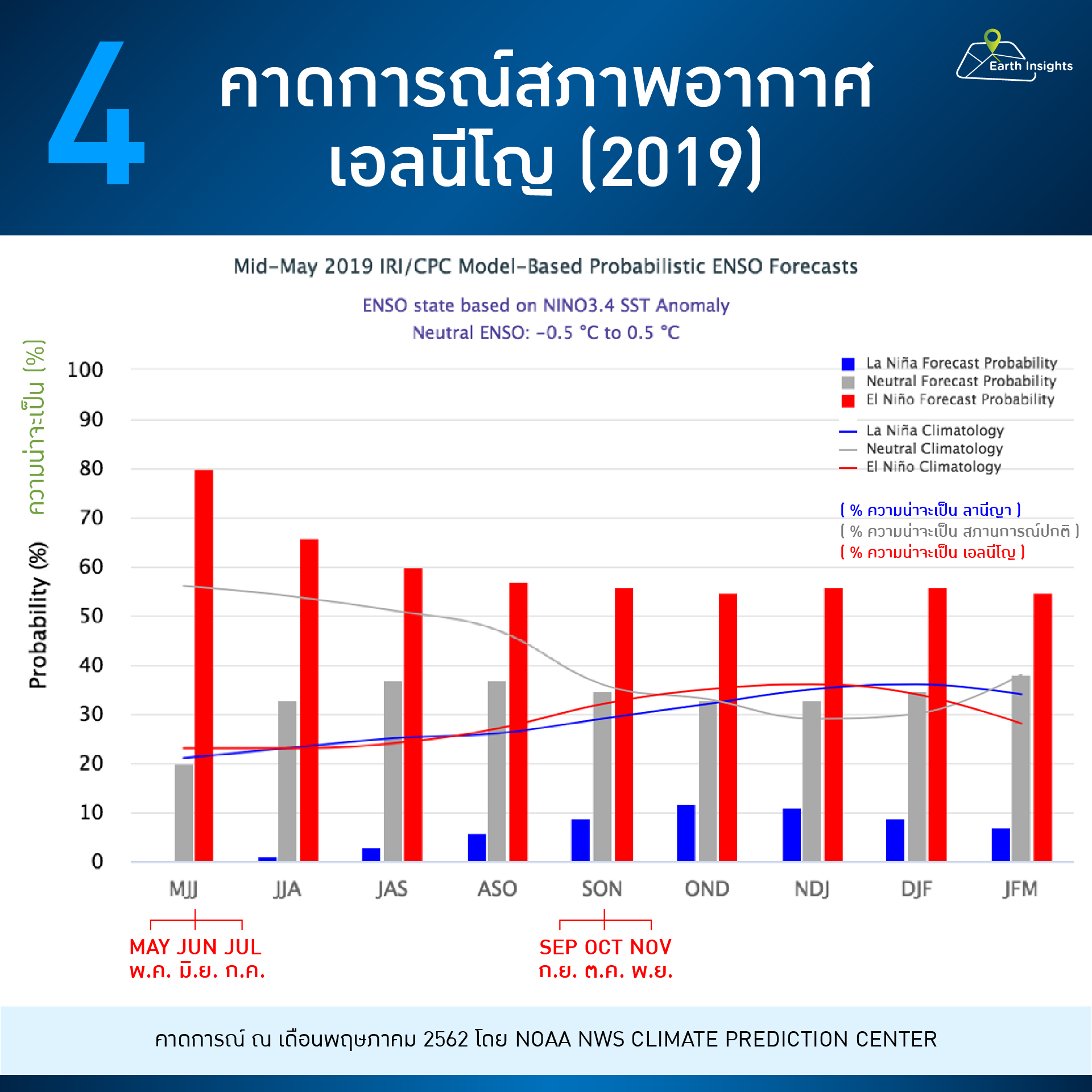 ซึ่งการคาดการณ์เมื่อวันที่ 19 พ.ค. 66 ที่ผ่านมา (ภาพที่ 3) เห็นไหมครับว่า เป็นปีแห่ง เอลนีโญ จริงๆ กราฟแท่งสีแดงสูงนำโด่งเลย ซึ่งก็จะแล้งมากนะครับ และ NOAA ก็คาดการณ์ว่า น้ำฝนจะน้อยกว่าปีปกติอยู่ประมาณ 10% แล้วมันจะขนาดไหนกัน เราก็ลองย้อยไปดูข้อมูลปี 2019/ 2562 (ภาพที่ 4) ลักษณะกราฟจะคล้ายๆ ของปีนี้เลยใช่ไหมครับ ก็นั่นแหละครับ ปี 62 ก็เป็นปี เอลนีโญ และประเทศไทยเราก็แล้งจริงๆ แม่น้ำแห้งเหือด ปริมาณน้ำในเขื่อนเหลืออยู่ไม่ถึง 10% การเกษตรเสียหายหนักมาก